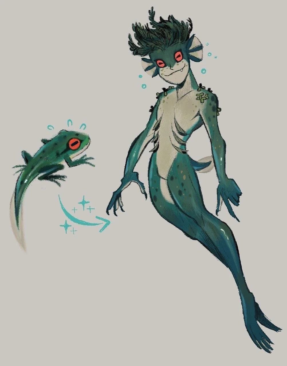 Greenish skin, noses don't protrude, webbed fingers and toes, gills on their throat, think more "frog people" than fish people. The average Fluvarri stands about 8 inches taller than the average Human. Their eyes tend toward contrasting colors; red, orange, yellow, but sometimes green or blue. Their hair tends to resemble seaweed and runs from light greenish yellow to dark green, almost black.